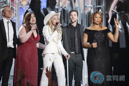 新人们结婚的背景音乐是“Same Love”,由嘻哈组合Macklemore & Ryan Lewis演唱。Macklemore & Ryan Lewis在本届格莱美上获得了4项大奖,包括最佳新人奖。当组合为新人们演唱时,麦当娜突然加入其中,与大家一起欢唱。