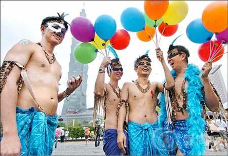 鼓吹素食主义的“素食男儿”,打出“给我男体,不要尸体”口号,连推车都是回收纸箱制成,环保做得很彻底;二度上街的“Bi the Way”标语“我们是双性恋”写得斗大,姿态比去年更突出;压轴的男同志游泳队“水男孩”也依然广获喝采掌声。